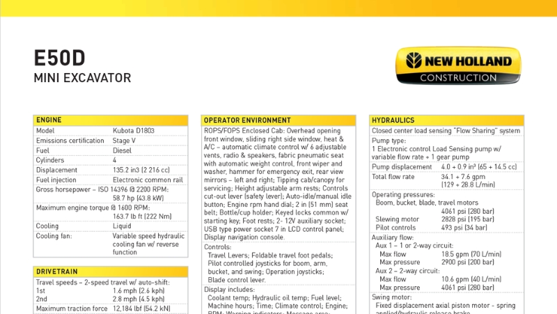 Powering demanding attachments is a key New Holland advantage.With the right attachment, New Holland's excavators can be used for a diverse range of jobs from fence installation to concrete breaking.The E50D arrives ready to run a wide array of attachments like hydraulic hammers, compaction plates, grapples and mulchers. Models are available with factory-installed couplers, buckets and thumbs.