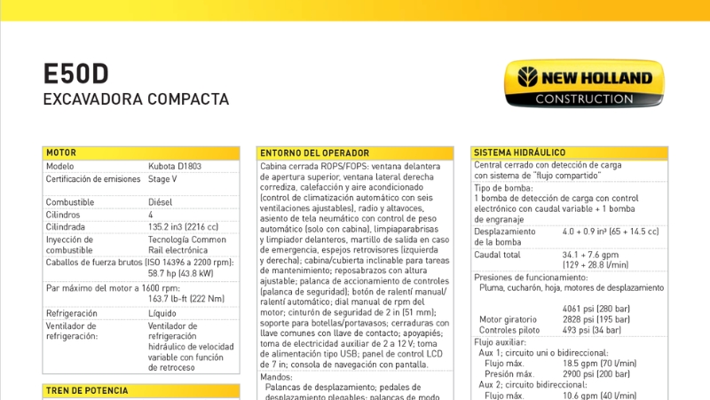 Las dimensiones compactas y las capacidades de excavación del modelo E50D de New Holland combinan potencia y versatilidad para aprovechar cada momento de su día de trabajo. Esta excavadora compacta, diseñada para operar todo el día, tiene un talento de excavación de primer nivel con la adaptabilidad para admitir una amplia gama de accesorios.